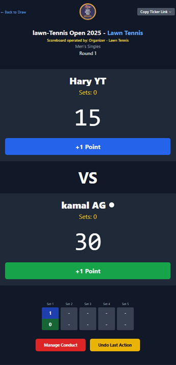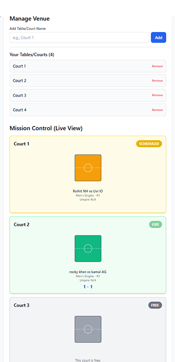Your Scorer starts the match on Court 1. Instantly, Mission Control updates, showing that court is now live. Your Chief Umpire sees the real-time status of every court and can schedule the next match for any free court.