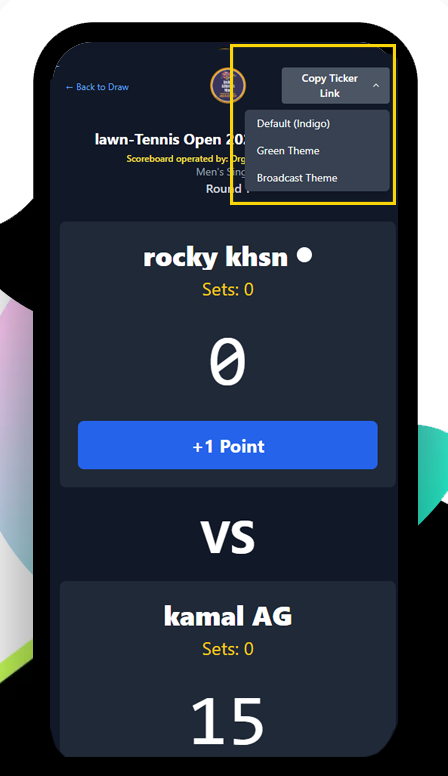 The scorer taps a point… and both the live stream ticker and the venue TV update instantly.