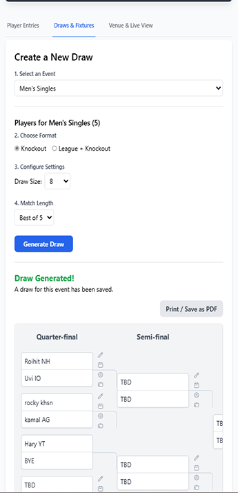 Once players are in, The organiser can create your draws with a single click event wise. You can Print them, share them, or send them to your team.